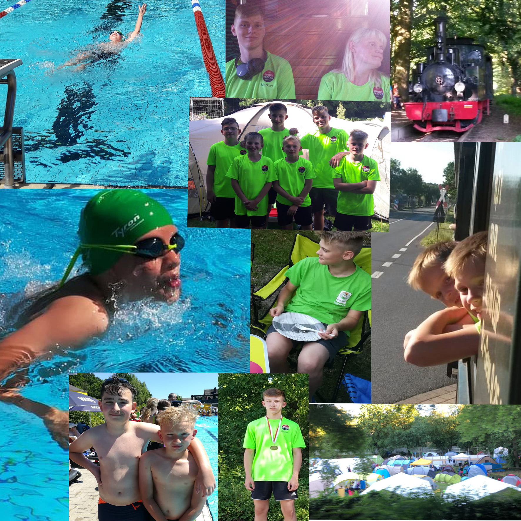 Wir freuten uns schon alle sehr darauf, da dieses Jahr ein Jubiläum war. Irgendwie war die Organisation in diesem Jahr für unsere Trainerin eine Herausforderung. Unsere Kampfrichterin hatte an diesem Wochenende Abschlussfest von der Schule. Von daher mussten wir dann ohne Kampfrichter los. Dann konnten wir vom Veranstalter dem Grafenschwimmteam aus eine Eisenbahnfahrt mit der Museumsbahn machen, diese konnten wir während des Wettkampfes immer sehen. Nun ja also haben wir uns Angemeldet und die Gelder überwiesen. So nun war alles fertig geplant und es sollte nun losgehen. Wir fuhren also mit unserer Trainerin auf der Autobahn und plötzlich kam weißer Rauch aus dem Motorraum, also rechts ran und das kurz vor unserer geplanten Abfahrt. Nun denn Abschleppwagen gerufen und wieder ab nach Bremerhaven. Tolle Sache, also den Bus ausräumen und alles in ein anderes Auto rein und wieder los. Eine weitere Herausforderung alle Klamotten von uns aus dem Bus in eine Mercedes- Limousine zu bekommen. Aber mit vereinten Kräften haben wir es geschafft und wieder ab auf die Autobahn. Dann noch eine Umleitung von 25 km um Brauchhausen wegen einer Baustelle, so kamen wir erst um 21.00 Uhr am Ziel an. Auf dem Parkplatz waren alle Schwimmer und Eltern versammelt, um schnell unsere Klamotten auf den Zeltplatz zu bringen. In einer Stunde stand dann auch unser Gemeinschaftszelt für 10 Personen und dann konnten wir endlich die leckeren Salate, Frikadellen und alle weiteren Leckereien die von unseren Eltern mitgebracht wurden genießen. Zu guter Letzt hatten wir dann noch gelesen, dass wir um 6.00 Uhr am Samstag zum Frühstück mussten. Puh, das war nicht so geplant aber was soll es waren ja für diesen Tag genug Meldungen und vor allem die Museumbahnfahrt geplant, also raus aus den Zelten, ab zum Frühstück und ab zum Einschwimmen um genügend Power für unsere Starts zu haben.